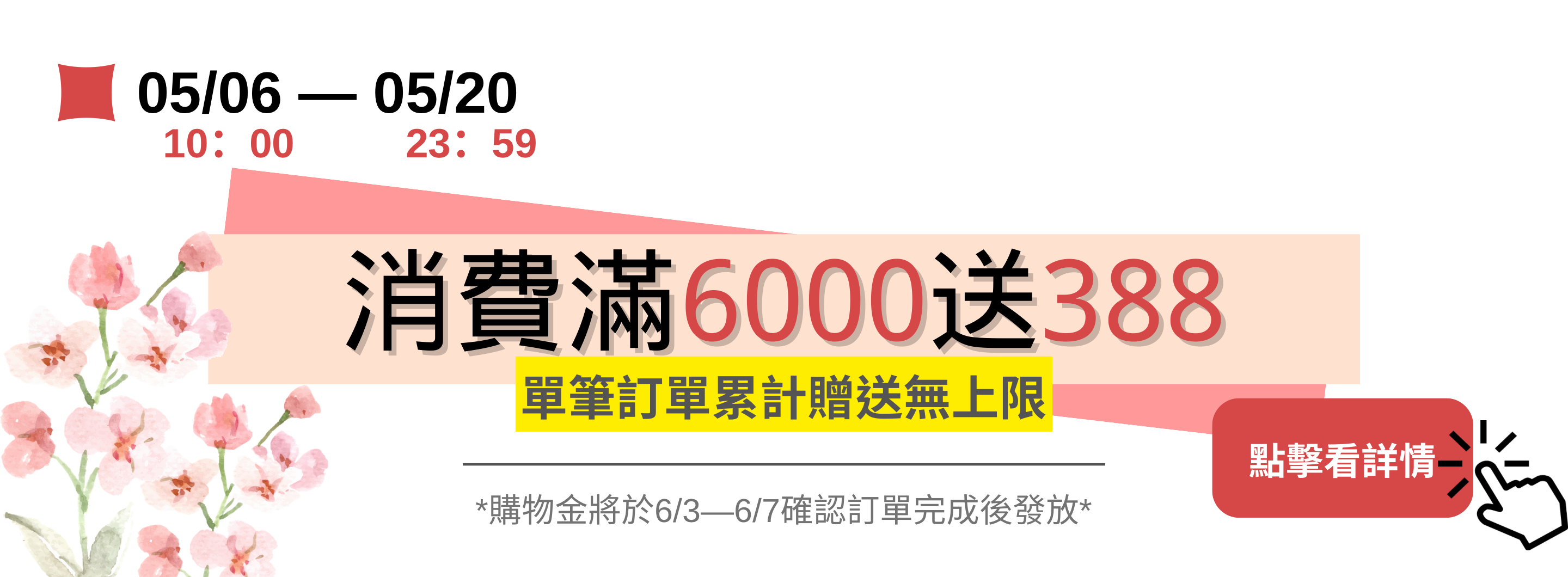 購物金會累計贈送喔!消費滿 $6000 送 388、滿 $12000 送 776 、滿 $18000 送 1164 依此類推!